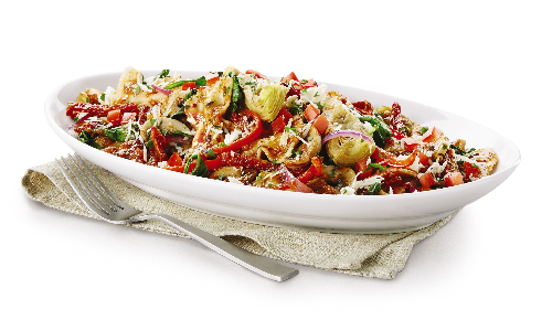 Fettuccini noodles in our own marinara sauce with basil pesto, topped with red peppers, red onions, marinated artichoke hearts, tomatoes, mushrooms, fresh spinach and a dash of crushed chilies. Finished with fresh tomatoes and feta.